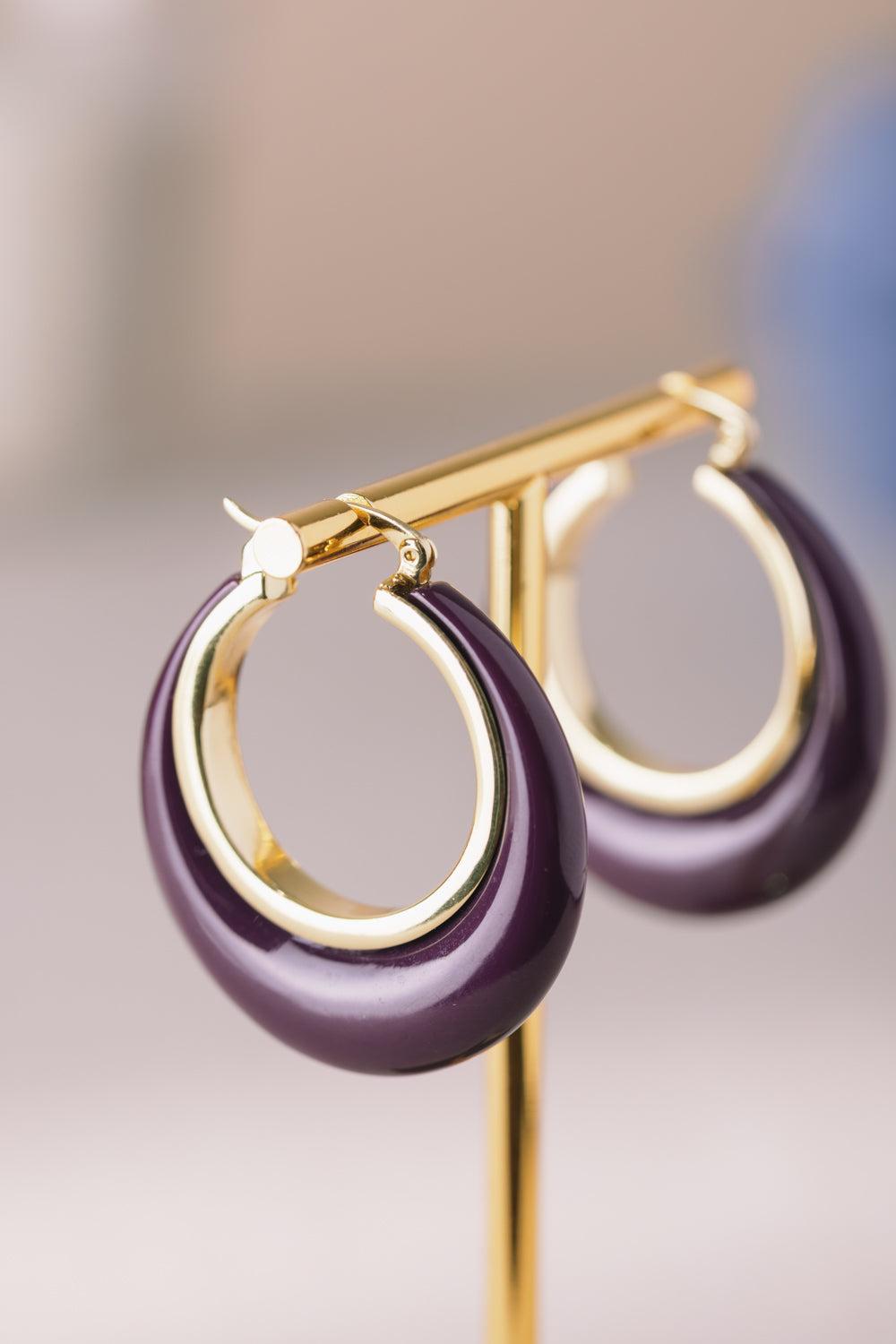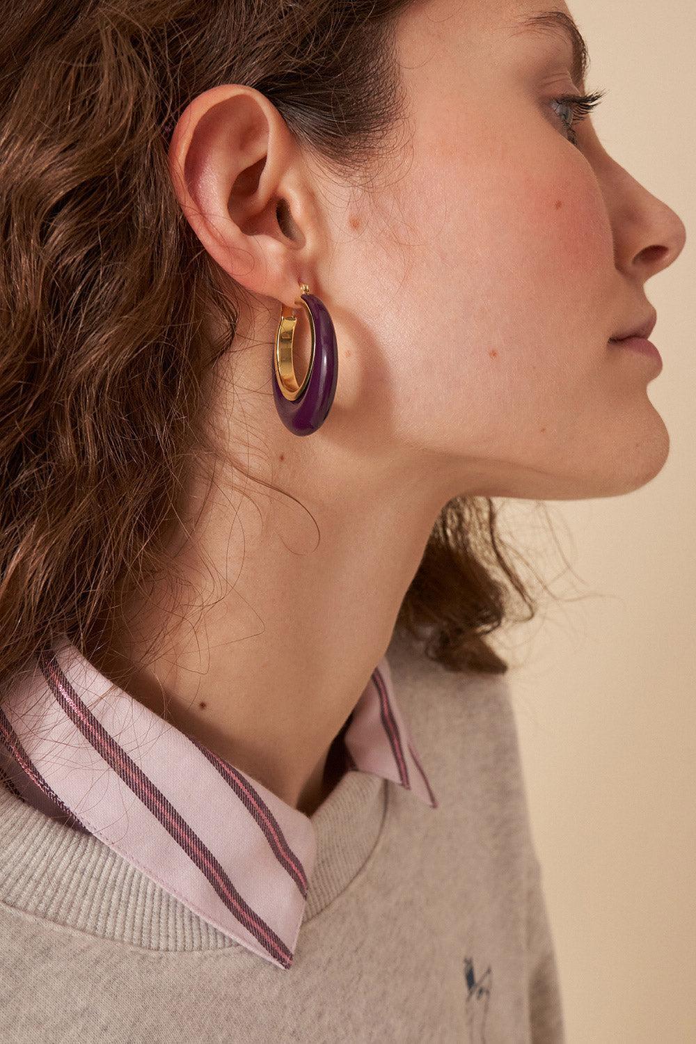 Nesta temporada, os brincos de argola expressam sua personalidade e optam por uma mistura de resina e latão dourado. Usadas em qualquer ocasião ou evento, essas joias vintage chiques ficarão elegantes na orelha.